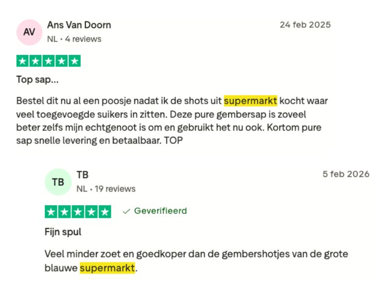 Gemberpercentage — Supermarktshots: 8-25%. Puur sap: 99-100%.